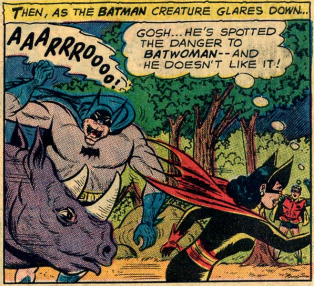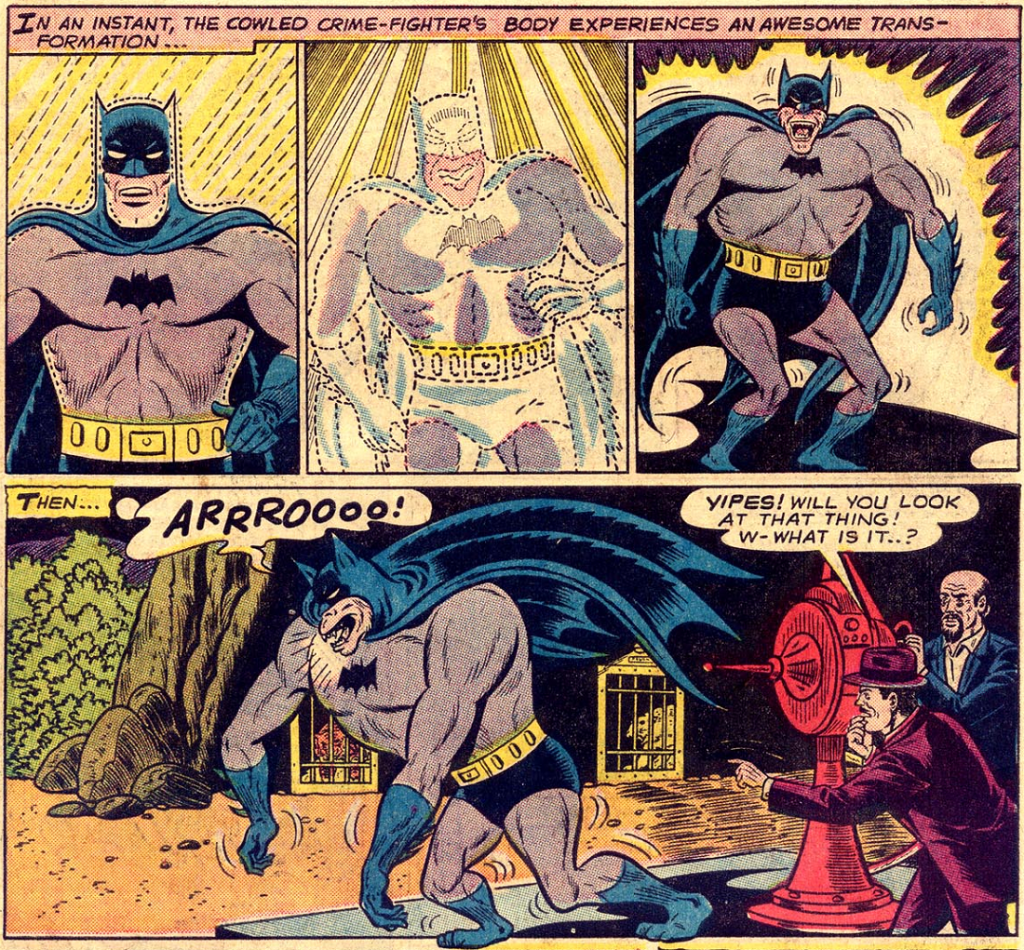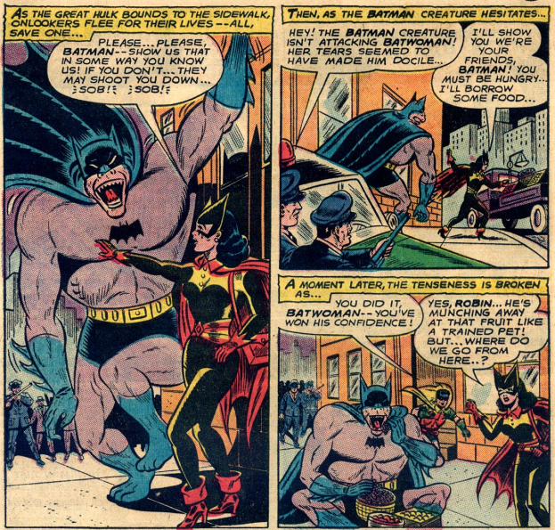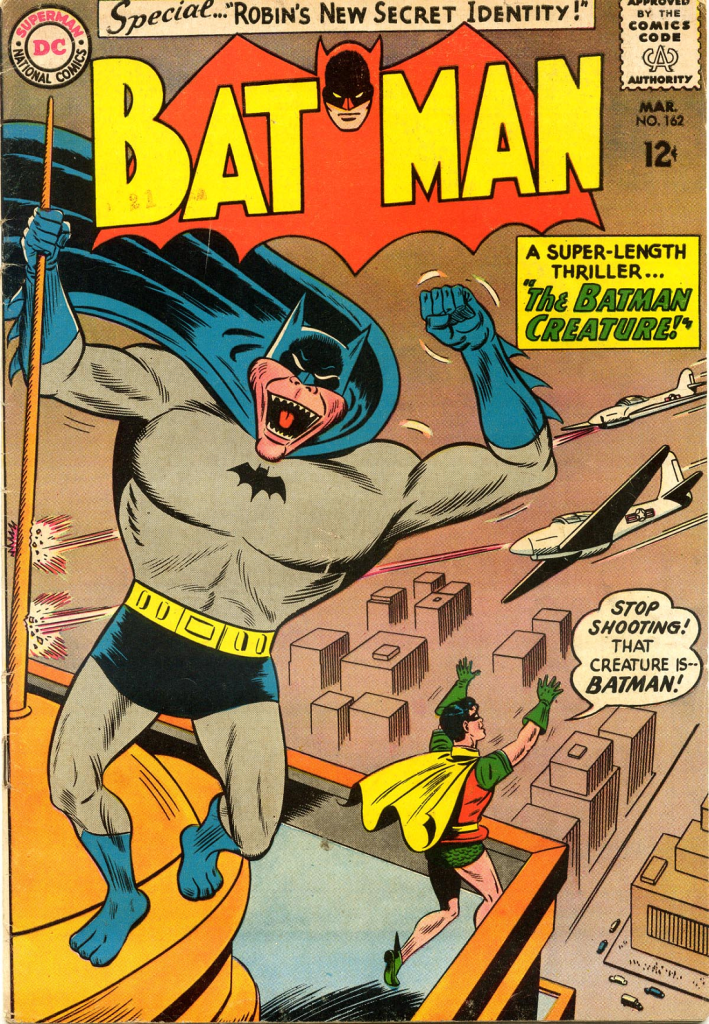 Switching gears, we’ll now examine a more monstrous Batman which also featured Batwoman in one of her final Silver Age appearances. Let’s dive into “The Batman Creature!” from Batman No. 162, March 1964.
