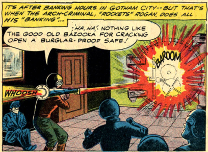Additional Silver Age tropes included crazy situations like cracking a safe open with a bazooka! (SIDE NOTE: It suddenly strikes me that “bazooka” may be one of those terms which is slowly passing out of popular usage. It’s a word that seems to be rarely used in modern media. For those unfamiliar, a bazooka is a rocket launcher intended to be used against armored vehicles.)
