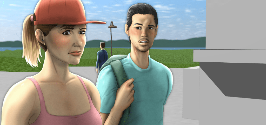 The background in this shot feels empty and low-resolution, like something from an open-world PlayStation 1 game. Also, Harmon’s forehead looks like he either suffered a large bruise or is half-Klingon.