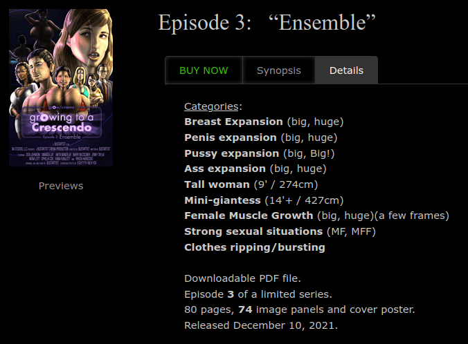 Overall, while not perfect, Ensemble is still recommended for gentle growth fans. The fantastic transformations, multiple sex scenes, and the mysterious underlying conflict brewing behind the scenes make for a rewarding read. Ensemble can be purchased for $9.95 at the following link: http://www.bustartist.com/store/comics/gcin2/index.html