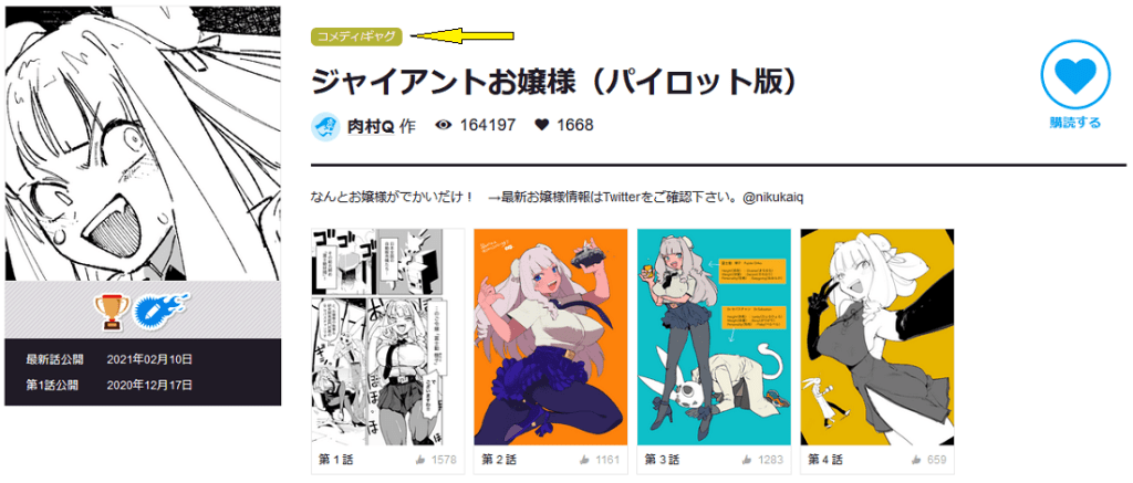Regarding its genre, the Shonen Jump rookie site describes Giant Ojo-sama as a “comedy / gag” comic: