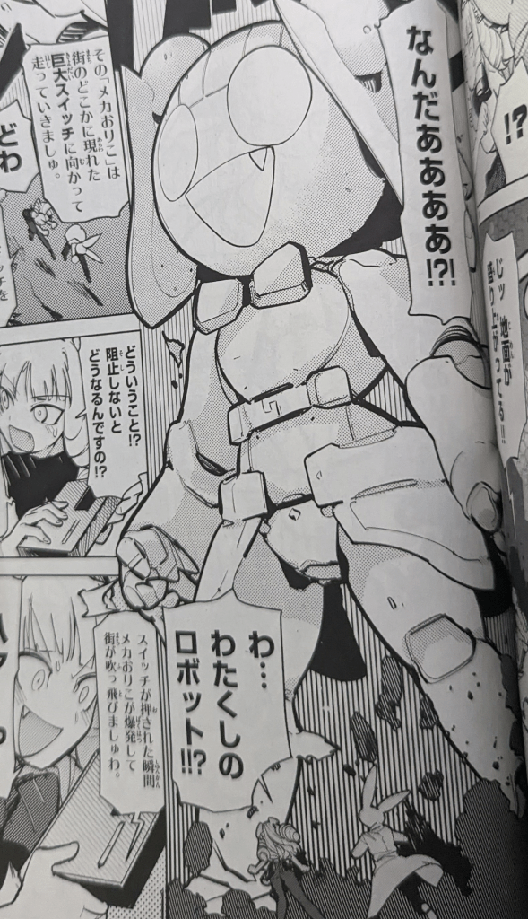 In addition to fighting those humanoid monsters, Oriko’s adventures in Volume 1 also included an encounter with the aforementioned enormous tentacled sea creature, and a foot race against a huge robot that she built as a child. By the way, the robot was also called “MechaOriko” メカおりこ which was a nice reference to the famous “MechaGodzillla” メカゴジラ, robotic doppelganger of Godzilla and a frequent opponent of that fire-breathing lizard.