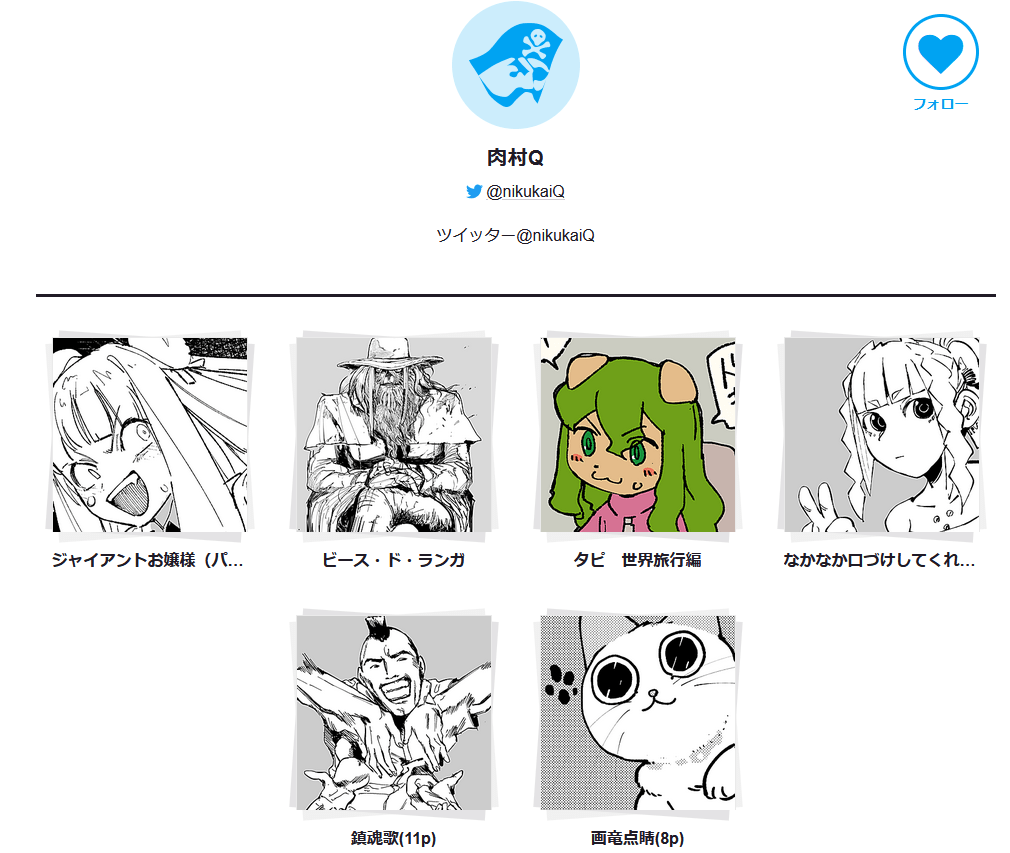 Nikumura-Q, @nikukaiQ on Twitter, created at least six different manga for the rookie competition. Giant Ojo-sama appears to be the most significant since it has the most pages, is the only one to have won an award, is the only one published at Sunday Web Every a.k.a. Sunday Ueburi サンデー う ぇ ぶり (official site for online distribution), and Giant Ojo-sama is the only one sold in hard copy.