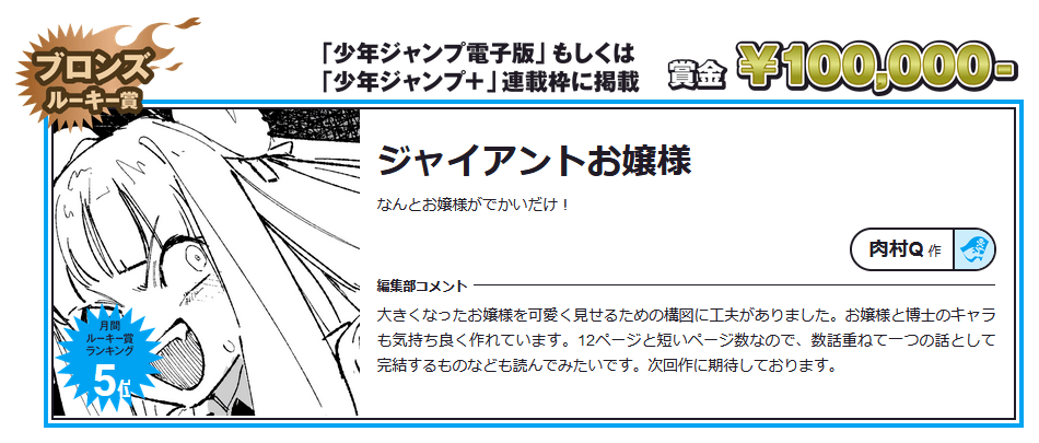 Today’s review will cover the first volume of Nikumura-Q’s manga “Giant Ojo-sama,” ジャイアントお嬢様 in Japanese. (NOTE: Also listed online as “Oriko the Giant.” I titled this review as Giant Ojo-sama because that’s literally the English title on the cover. Couldn’t bring myself to keep the hyphen between “Giant” and “Ojo-sama” though, had to draw the line at unconventional hyphen usage!) Its creator Nikumura-Q, 肉村Q, won Shonen Jump’s Bronze Rookie Award in December 2020. Those awards, also called the “Monthly Rookie Grand Prix,” are given out to ten different artists every month. Nikumura-Q received a ¥100,000 monetary reward which equated to about $960 at that time. (NOTE: That conversion was taken from the OANDA currency converter and based on the 1 December 2020 exchange rate.)