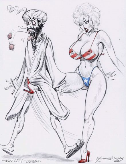 Additionally, being American, it is unsurprising that Zimmerman was clearly affected by the 9/11 terrorist attacks. As evidence, one of his earliest drawings as a freelancing creator featured a woman wearing a patriotic bikini and kicking Osama bin Laden.