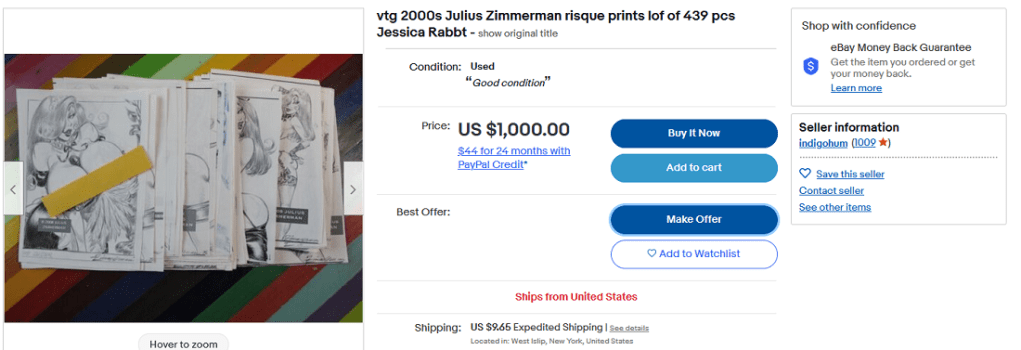Initially, he sold sketches at eBay until they restricted such content. Then he switched to Yahoo auctions, but after awhile that also proved unworkable. Finally, he moved to NaughtyBids where he used the handle “Eyesinge.” After selling the hard copies, he sent digital reproductions to fans via the ZimmermanDrawings Yahoo group.