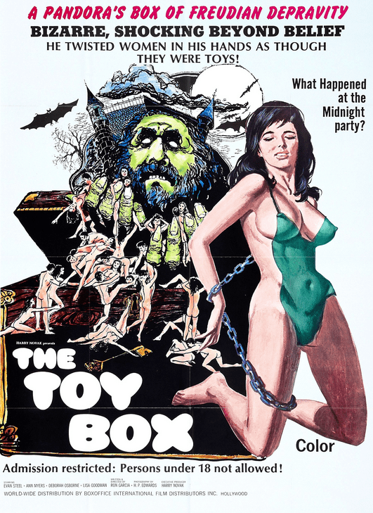 “The Toy Box” is a soft-core pornographic film released in 1971. Its poster depicts several tiny naked people in the clutches of an eerie old man without pupils. Does it actually have sizey elements? The answer is … yes, of a sort. First, let’s briefly discuss the main people involved in this production.
