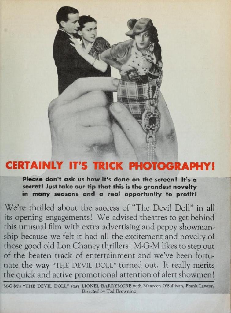Of note, at least one reviewer considered The Devil-Doll to be a “… dull picture.” That was Henry Kuttner’s (H. K.) opinion in the December 1936 issue of Thrilling Wonder Stories. Nonetheless, H. K. also noted that “There are a few good shots of the animated dolls; although these are merely further developments of the homunculus scenes in ‘The Bride of Frankenstein.’ ” Personally, I enjoyed the special effects during the lengthy sequences of small people running about stabbing evil doers with mini-daggers.
