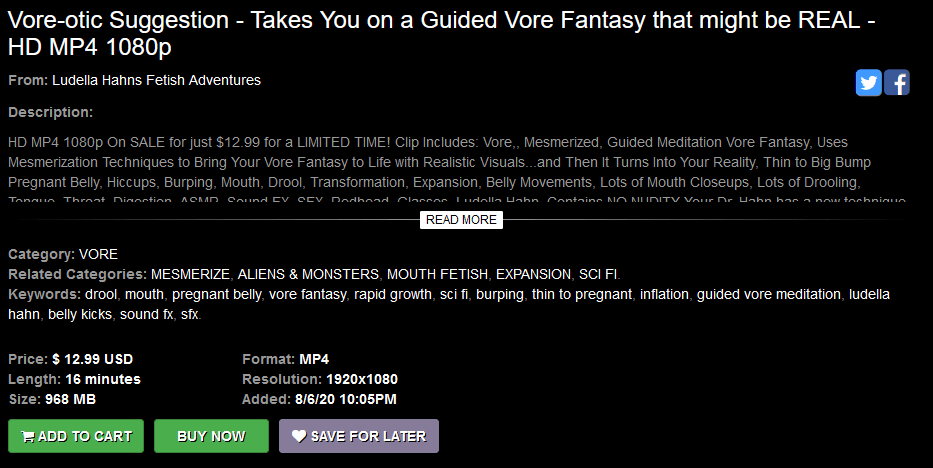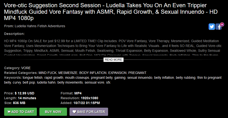 This holiday we’re going to examine a Ludella Hahn video which should be to your liking. “Vore-otic Suggestion Second Session” is a 14-minute long clip which was released on October 7th, 2022. This is a follow-up to the first Vore-otic Suggestion which came out in early August 2020. The description for the initial production can be seen below: