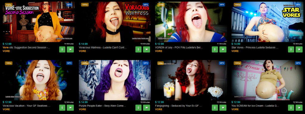 Ludella Hahn is no stranger to cannibalistic storylines. The image below showcases just eight of her numerous vore-themed productions. A search on Clips4Sale returned 145 clips under the VORE category. However, that search also returned multiple versions of the same clip in different resolutions. Thus, the true number of Ludella Hahn’s videos is not as high as 145, but still may be over a 100 ❗