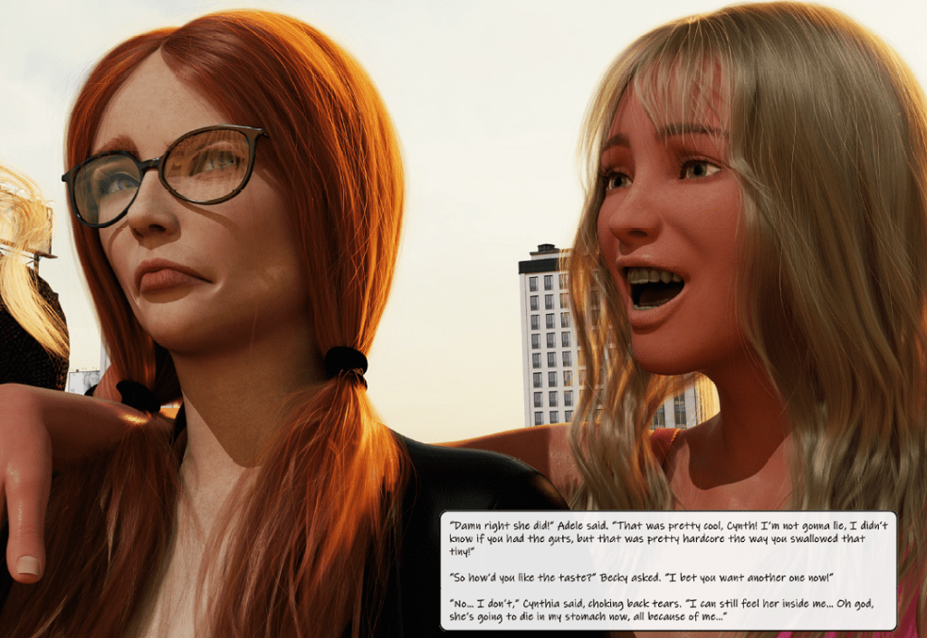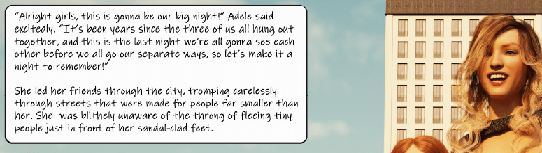 Cynthia is the main character. RedFireD0g told me she “… becomes a very different person by the end of it, for better and worse.” The ladies go out for a girl’s night in a city populated by human beings much smaller than themselves. It has been years since the three of them last hung out together and this was going to be their last night together before going their own separate ways. Accordingly, they hope to “… make it a night to remember!” Unexpectedly, their plans don’t involve fancy cocktails or dancing at a nightclub with cute guys, but instead involves murdering small humans. Adele and Becky are psychopaths who are comfortable with and indeed enjoy killing the tiny inhabitants. In contrast, Cynthia was initially reluctant. After some teasing and having her eyeglasses broken, Cynthia gives up her reluctance and joins the other two in their bloody celebration. There was also some sex acts. Overall, the narrative was straightforward without surprises.