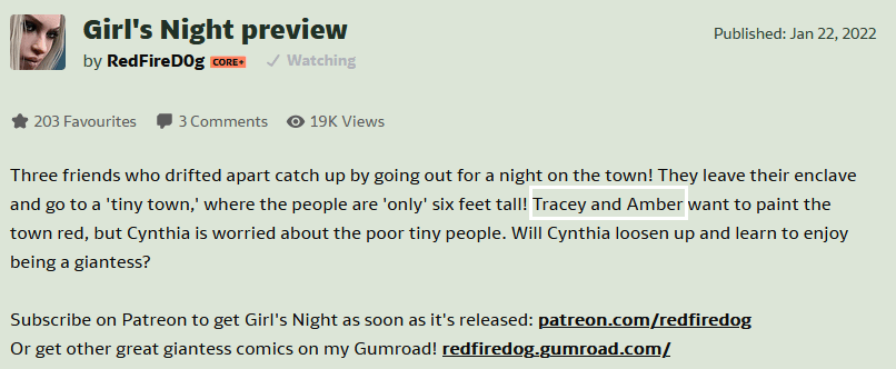 Girl’s Night was a collaboration between RedFireD0g and Jack of Bullets. It is focused on three giant women: Adele, Becky, and Cynthia. Of note, the initial previews on DeviantArt gave different names: