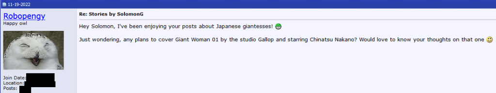 Overall, Giant Woman 1 is recommended, but with a warning that it’s only available with Japanese audio. Furthermore, it was made in the early 2000s and therefore is only available (to the best of my knowledge) in low-resolution, 640 x 480 pixels.