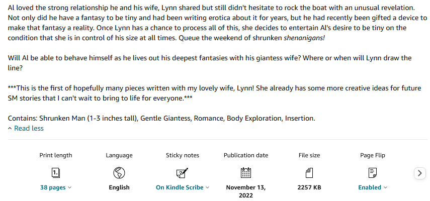 Right off the bat, this is more of the same. An unnamed “tech giant,” usually that term is applied to large information technology companies, mailed a size-changing watch to Al after reading his erotic shrinking man (SM) stories. Quite a fortuitous development! The watch is controlled by smartphone software which Al installs on his wife’s phone. Lynn shrinks Al and treats him roughly, often at his request. There was no bloodshed or breaking bones; however, it was just violent enough that gentle fans may want to skip this. For instance, there was a brief scene during which an inebriated Lynn tried to stretch her tiny husband back to normal size by tugging on his ankles and wrists. Of course, that attempt was unsuccessful, but it was painful for Al until she gave up that ill-advised course of action.