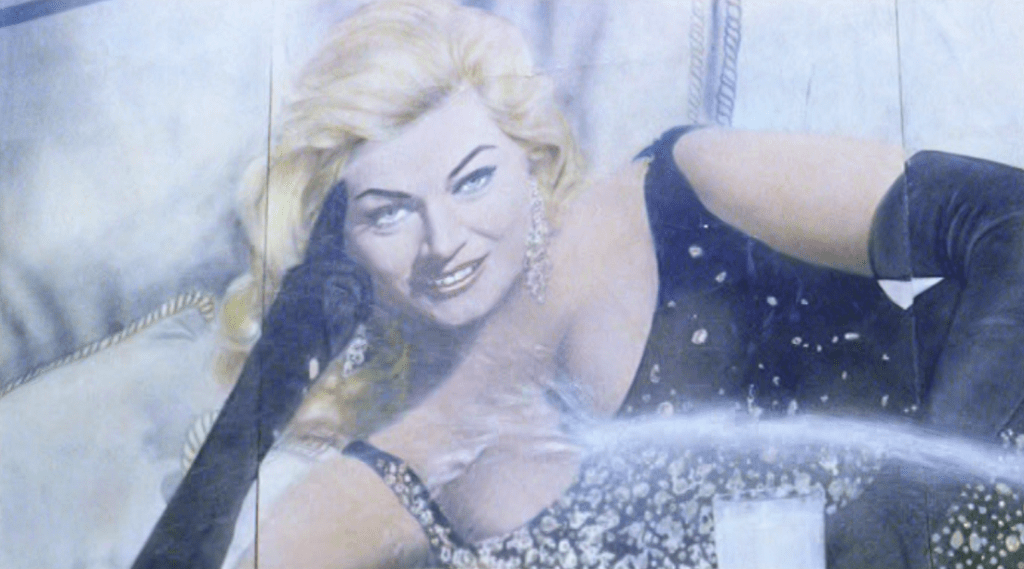The billboard features Anita Ekberg lounging on a couch and encouraging people to drink more milk (Bevete più latte). The existence of a public sign featuring the voluptuous blue-eyed Swedish blonde compels Dr. Antonio to attempt increasingly desperate schemes to remove it. Anita’s sign begins to affect his sanity and he imagines her taunting him in real life.