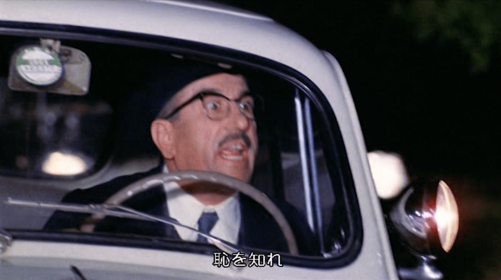 Dr. Antonio spends his free time as a self-appointed defender of Rome’s purity. That’s not what he literally calls himself, but he does drive through “lovers’ lane” in the middle of the night shaming people. Obviously, the couples were never shown naked and no actual intercourse was depicted, but the implications were quite clear. Alternatively, it could have merely been men and women going to a secluded park to sleep next to each other in a car, but I have serious doubts about that interpretation.
