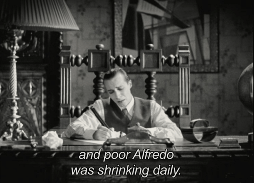Alicia had expressed a love for silent films during a brief encounter with Benigno before her accident. Accordingly, Benigno goes to the cinéma and talks to the now-comatose Alicia about one of those silent films. Viewers see a black and white recreation of the film he is describing. In that bit, a female scientist develops a formula which inadvertently causes her male acquaintance to shrink.