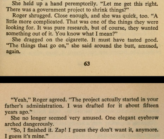 It was somewhat surprising that the government let Rogers go and were not aware of the practical results of his research. At no point did a shadowy agent try to reclaim the device designed using federal money over the course of one and a half decades. Perhaps a counter argument is that the supervisors were incompetent. Fair enough, I can accept that. However, even a dullard would realize that a machine which can instantly make thing small would be valuable. If nothing else, point such a device at an enemy military and make them tiny. Alternatively, make a giant pile of garbage into a pebble or reduce tons of radioactive waste into tiny pellets. This part of the story wasn’t a deal breaker, but it was odd that no one in the U.S. government was aware of what Roger had accomplished. More believable would have been if some evil G-man had shot Roger in the head (and his poor mother so no one would be left that cared about Roger) and took his machine. Alternatively, a buxom Soviet agent could have befriended Roger and pried the device out of his hands with promises to let him touch her boobs. Instead, nobody cared or was even aware.