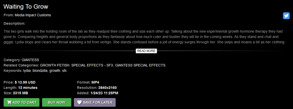 Now it’s time to check in on Media Impact and see what they’re up to! Accordingly, let’s analyze “Waiting To Grow” a 12-minute production which was released on January 24th, 2023. It features Blondzilla and Lydia, two lovely ladies who have each appeared in more than 60 videos released by Media Impact Customs. (SIDE NOTE: For previous reviews of these performers see Giantess Zone’s “Lydia and Keri in Giantess Fascination SFX” and Blondzilla Job Interview growth in the Top 10 (kinda) Shoe Bursting Scenes — Part Quatre!)