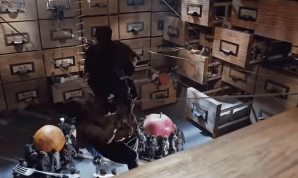 The word dwarf conjures up images of the fantasy race found in J. R. R. Tolkien’s novels and in the role-playing game Dungeons and Dragons that Tolkien inspired. Which is to note that I think of fictional dwarfs as being the same height as atypically short, but not impossibly so, humans. Between four and five feet tall is the height of the average dwarf in my mind. Note that the English-language Wikipedia entry described the small humanoids in Kingsajz as “gnomes” while unofficial English subtitles called them “dwarfs.” In the original Polish they were called “krasnoludek.” (SIDE NOTE: An anti-communist movement, the Orange Alternative, used krasnoludek imagery to protest the Soviet regime.)