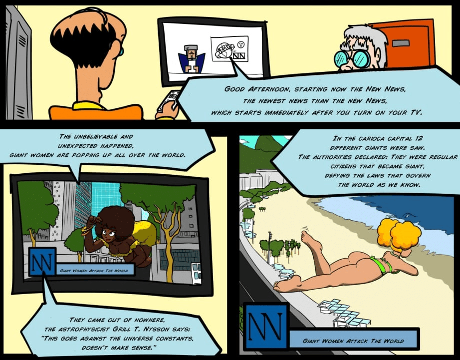 Welcome back to There She Grows! Today’s review of “Bronze Skin Inc” was requested in mid-March by a Twitter user who was such a fan that they personally identified as a Bronze Skin employee. The pilot, “Shake My Giant Butt,” was released on July 24th, 2019. Bronze Skin is the work of Pedro Barreto and is completely free to read! (SIDE NOTE: Click here for an interview with Pedro, and click here for the earlier review of Skinwalkers Chapter 1.) Thirty-eight chapters have since followed the pilot. Brazilian creators like bmtbguy and Pedro are quite generous when providing free content to the size community. To which I say “Obrigado!“
