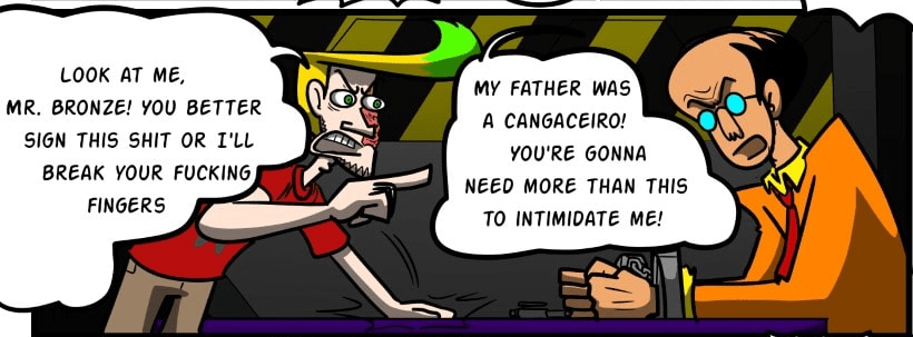 Alas, in other instances, no explanation was given. For example, Mr. Bronze, the owner of Bronze Skin, was questioned by a thug. In response to a violent threat, Mr. Bronze said his “… father was a Cangaceiro!” Yet, no definition for Cangaceiro was given. Thus, the reader was forced to guess. Or Google the meaning which truth to be told turned up an answer in less than a second.