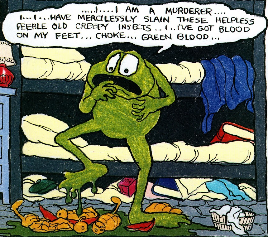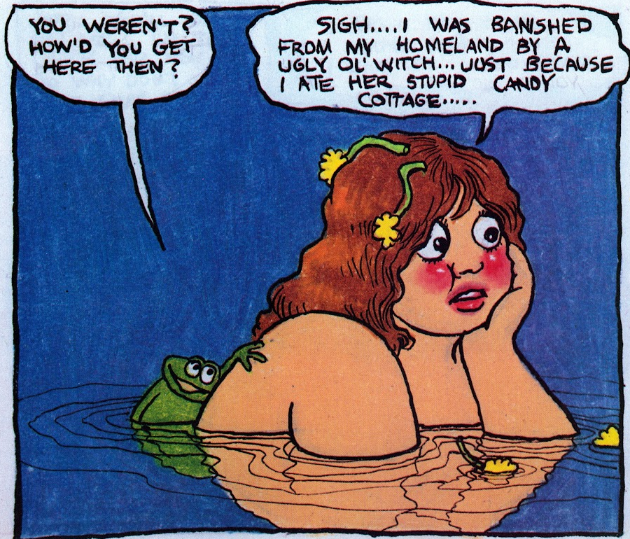 Safe in the surrounding underbrush, Oggie was unable to return to the area where he first arrived. Instead, he was obsessed with Guntra and thus was unable to leave. She attempted to lure him out of hiding and into her belly, but he managed to steal a kiss then quickly flee. This began an unusual courtship in which the toad stole kisses and brief conversations while his paramour fought the temptation to eat him.