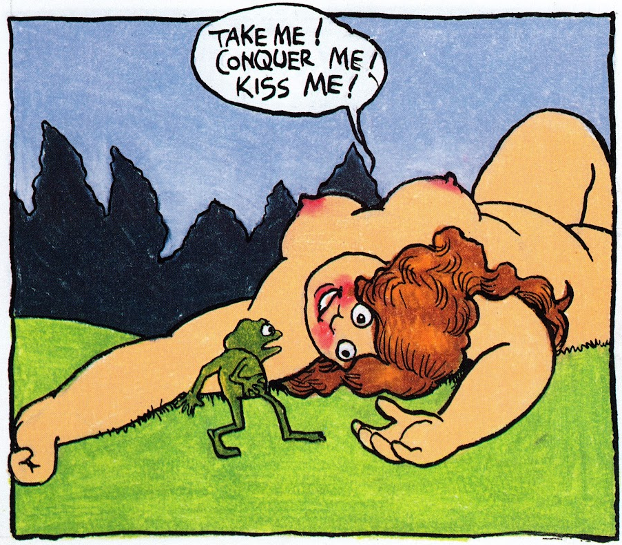 Crumb drew large plump women. Some of his comics came rather close to giantess themes. Comics such as “Anal Antics” in which small men, call Snoids, live in women’s assholes and “R. Crumb versus The Sisterhood” in which a man (somehow) fits his entire body inside a tall woman’s vagina. (NOTE: She was tall, but not inhumanly so. She appeared to be less than seven feet in height). Accordingly, artists and writers of Amazons and giantesses such as Biggals, Julius Zimmerman, and Sabrina Pandora were inspired by his work.