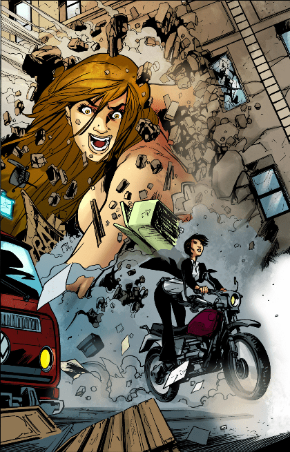 Giantess Containment Bureau first appeared on September 3rd, 2012, and ran for a total of eight issues, concluding on February 28th, 2014. The creative team consisted of Malenkaya as the author, Peter Logan (a.k.a. Mariano Navarro) as the artist and inker, and Chris Flash (a.k.a. Hernán Cabrera) as the colorist and letterer.