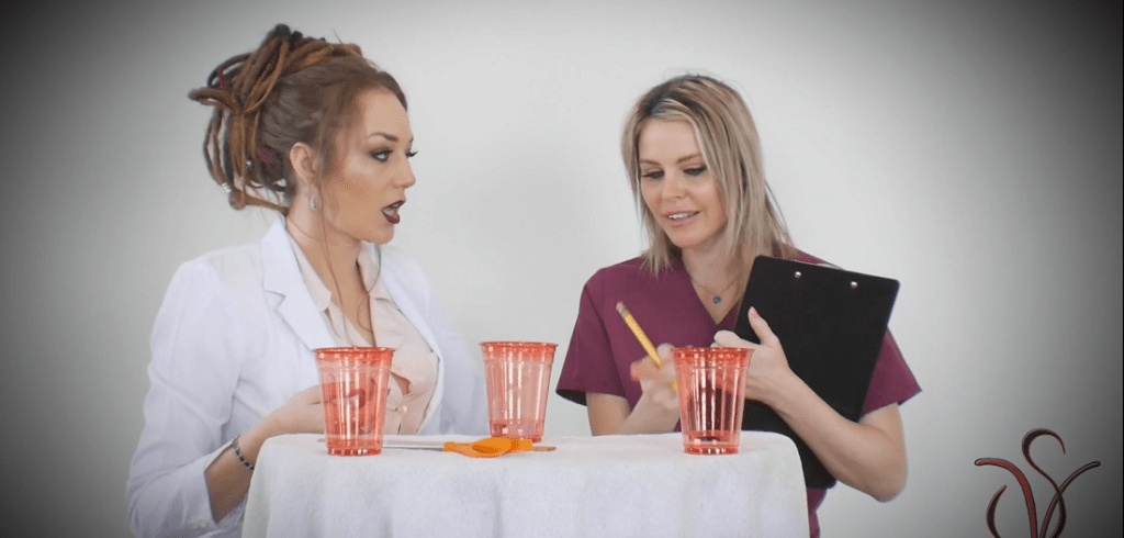 To give some background on the performers, both of these videos feature the same actresses: Sablique Von Lux and Kody Evans. Sablique has appeared in nearly every video (294 out of 316 total clips as of this writing) made by Pick Your Poison Fetish Theater, but Kody Evans has only appeared in these two. (NOTE: Title screens at the end of these clips provide contact information for Von Lux Media. Thus, Sablique Von Lux presumably owns Pick Your Poison Fetish Theater. Curious why they didn’t just name the studio “Von Lux Media” to keep the branding simple and consistent.)