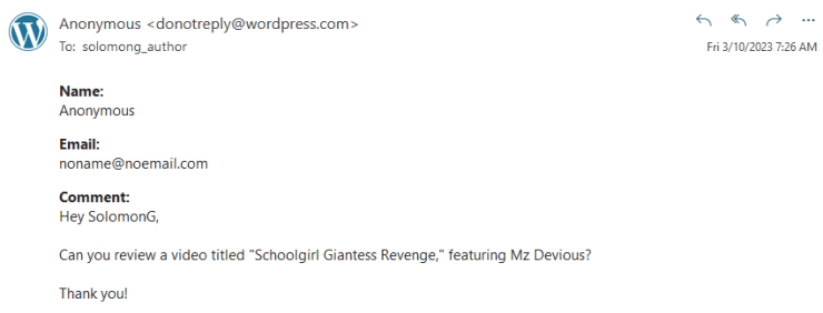 Welcome back to There She Grows! This review of “Schoolgirl Giantess Revenge” by Mz Devious was requested by an anonymous reader in March of this year. None of her works have been covered before so let’s dive in.