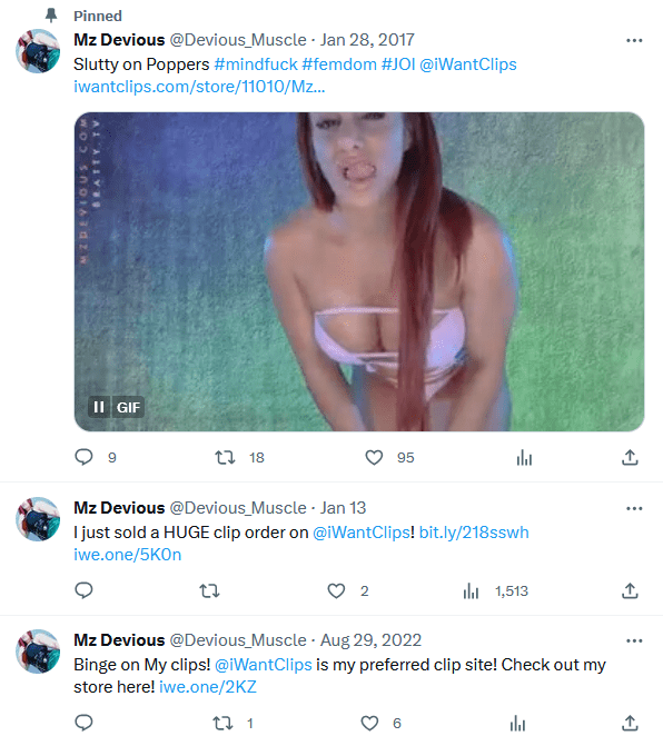 Mz Devious is a female bodybuilder and has also been a self-described “Online Financial Domme since 2008.” She has audio and video clips for sale at NiteFlirt and iWantClips as well as through two different studios, Devious Muscle and Mz Devious Fetish Clips, at Clips4Sale. (NOTE: At least one of the sites, a streaming platform called “mzdeviousvideos.com,” is now off-line. Also, a few of the links from Mz Devious’ official site to clip sites were broken.)