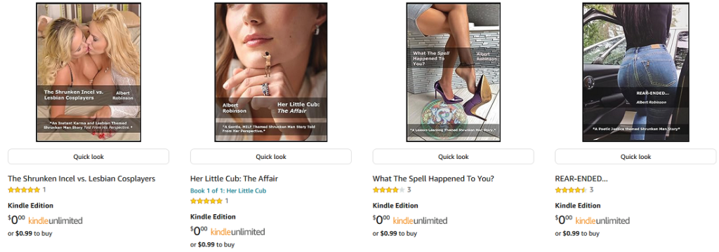 Each is a quick read and costs about a dollar, $0.99 to be specific, or can be read for free via a Kindle Unlimited membership. The longest examples, Her Little Cub: The Affair and The Shrunken Incel vs. Lesbian Cosplayers, are both 32-pages long per Amazon. They can be read in half of an hour and experienced readers will finish them much quicker.