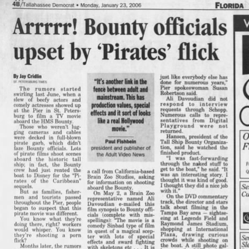 According to an article in the Tallahassee Democrat, local officials rented rooms to the crew, provided storage for equipment, and roped off areas near the boat. Unfortunately, they were misled and were unaware that Pirates was going to be a porno. (NOTE: That article, “Arrrrr! Bounty officials upset by ‘Pirates’ flick,” appeared in the January 23, 2006 edition of the Tallahassee Democrat.) I can understand why city officials were upset at being misled. However, I can also understand why the production felt like they had to misrepresent the situation as prejudices against adult entertainment would have stymied their efforts.