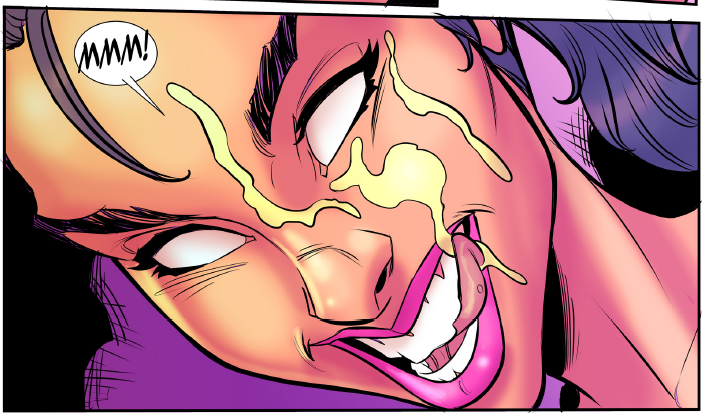 Regarding areas to improve, coloring decisions in Boobpire: Resurrection were often bewildering and inconsistent. For instance, is it just my villainous eyes or does the cum on this woman’s face look rather yellow? J. J. McQuade was the only artist listed so presumably did the coloring. Was McQuade trying to convey a “facial” or a “golden shower“?