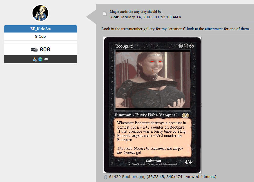 Of note, the term Boobpire, meaning a breast-expanding (B.E.) female vampire, was already in circulation. For example, a mock Magic: The Gathering card appeared on the Breast Expansion Archive Forum in mid-January 2003 with actress Natalie Portman (perhaps most famous for Star Wars’ Padmé Amidala) as a Boobpire.