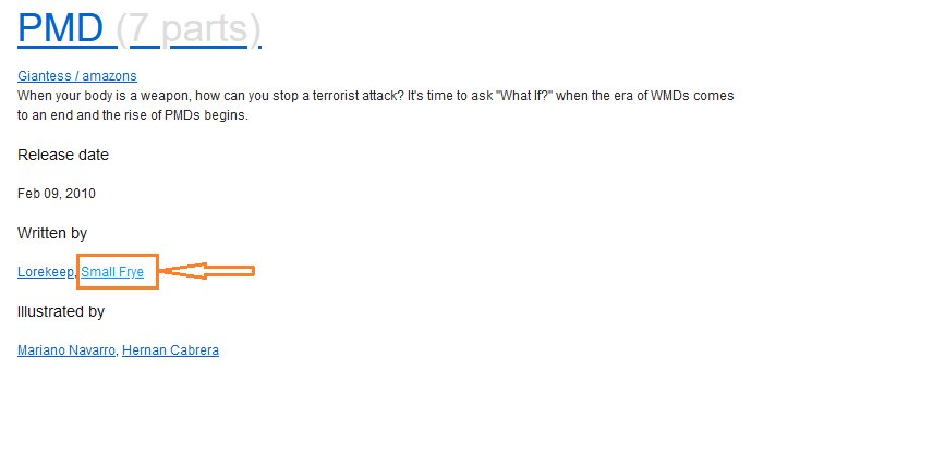 In contrast, the cover for “Hero of Size” lists Lorekeep and Bob Saget as the authors. Lorekeep wrote the initial issues of Hero of Size and PMD; therefore, he should be credited. Bob Saget wrote later issues of both, but that doesn’t change the fact that Lorekeep created them to begin with. Additionally, a May 18, 2012 screenshot maintained at the Wayback Machine showed that Small Frye also wrote part of PMD. Yet, today there is no mention either on the cover or under the Details tab that Small Frye contributed to PMD. Why not?