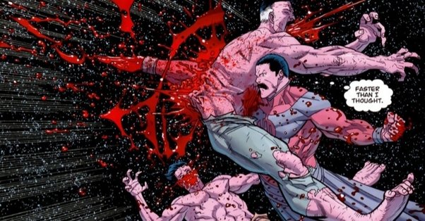 Contrast that to the gruesome violence in the following panel taken from an “Invincible” comic written by Robert Kirkman. In this example it was clear that one character’s hand went through the chest of another character.