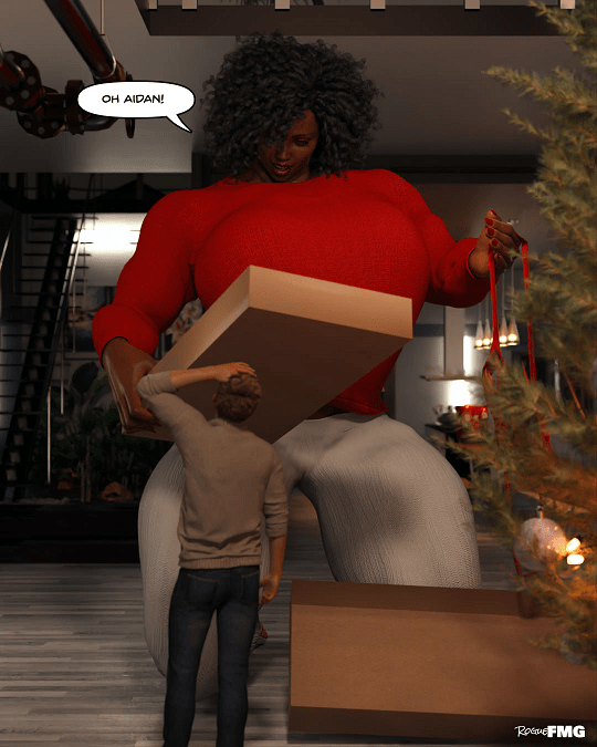 The comic featured a couple consisting of normal-sized man Aidan and giant-sized woman Jala. (SIDE NOTE: Occasionally, his name is spelled on DeviantArt and in Gumroad comic descriptions as “Aiden.”) They were celebrating one last Christmas in their current house before moving to a larger place. The most excitement in the narrative came from a brief growth scene and topless nudity. Which is to say not much happened in this story. There were no sex scenes and there wasn’t any conflict or relationship drama.