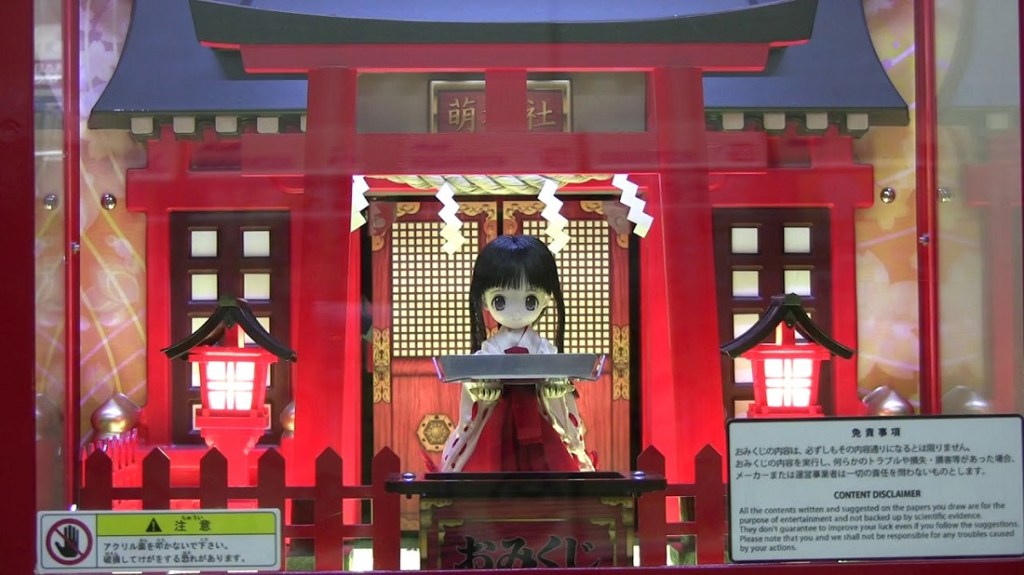 A fortune-telling machine (the 萌神社 kizashi-jinja shown above) gave me a favorable omikuji (fortune-telling paper strip) with a small blessing. It was not the best possible blessing, but it also was not one of the curses a person might get! So, all in all, not a bad outcome.