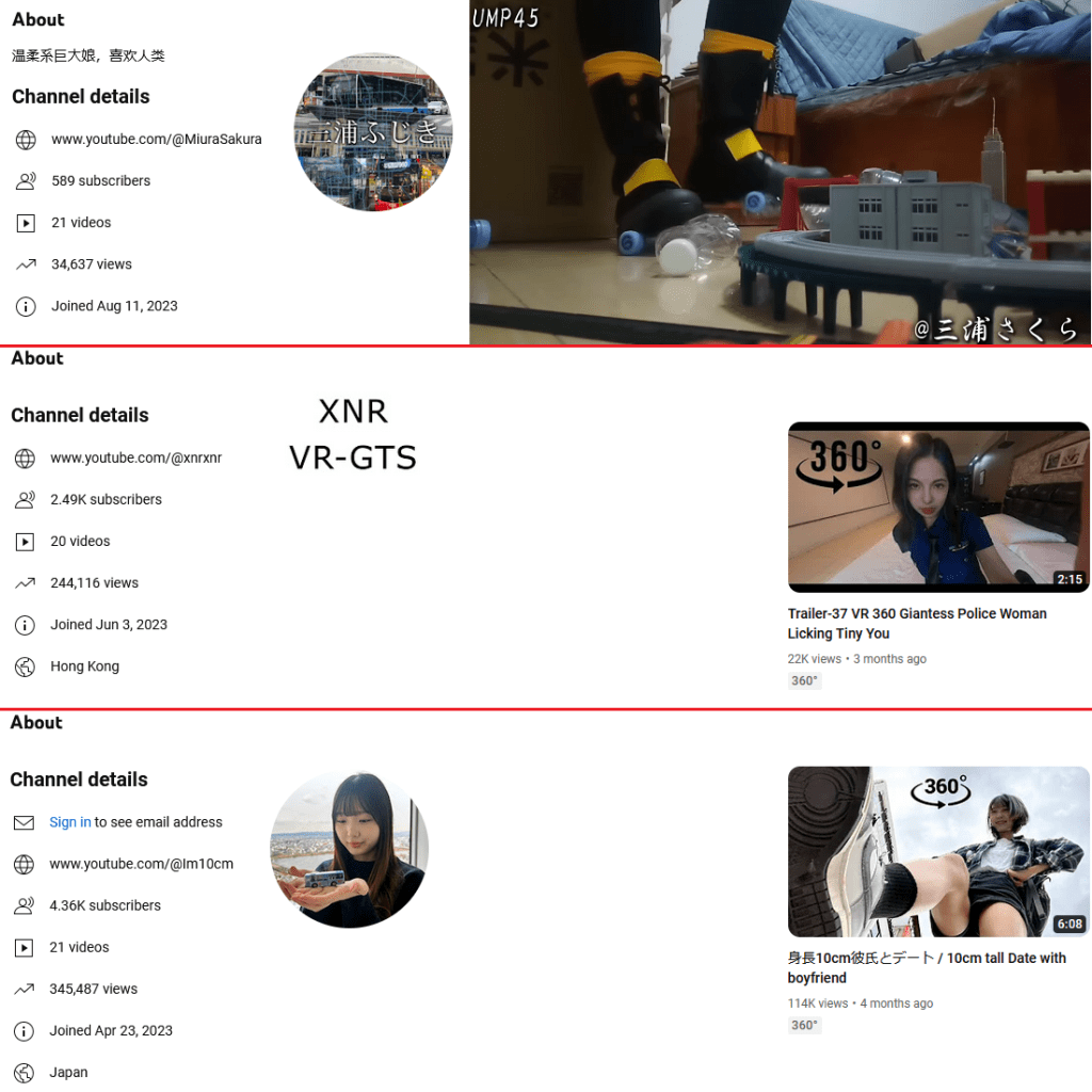 More substantial indications of growing interest in size fetish included at least three new YouTube channels launched in 2023 by creators in Asia as shown in this collage: