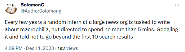 It is understandable if an amateur size fetish writer is unable to dedicate time to research a topic before blogging about it. Amateur writers are not paid or if they are paid it is far less than a professional writer. They rely upon other jobs to pay the bills. They have to squeeze in research between other priorities in life. In contrast, media outlets like Vice pay their employees to write and thus the writers have more time to research. Although, Vice declared Chapter 11 Bankruptcy in May 2023 (see “Vice Media Files For Chapter 11 Bankruptcy” by Jesse Whittock for details) so they are not as financially secure as I assumed.
