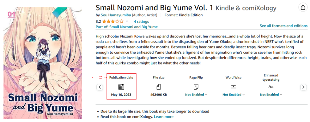 Japanese manga had a number of series focused on a giantess main character. That included 70 Meter Girl, Big Girl on a Small Island, Chieri’s Love is 8 Meters, Giant Ojo-sama, and This Hero is Really Cute (heroine grows to giant size). Kodansha USA released an official English-language version of Small Nozomi and Big Yume. Kodansha first published that manga about a shrunken girl and her regular-sized associate in 2019 in Japan.