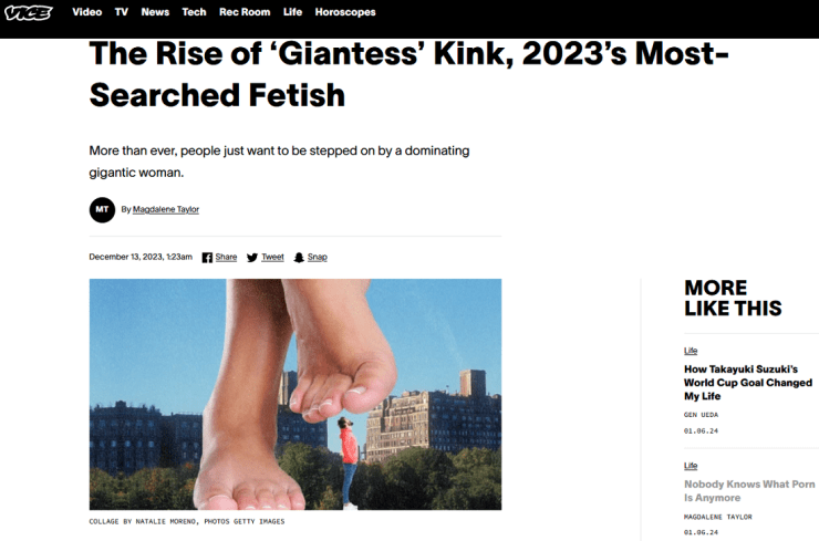 Psychology Today in 2015 and Playboy in 2016 released earlier articles on the topic of giantess love or macrophile. Recently, Vice Media released their own piece about giantess lovers in mid-December 2023 based upon year-end search statistics from Clips4Sale, a site which described itself as “the world’s #1 fetish video marketplace.” Other writers released similar articles also based on that Clips4Sale data. For more context please read Aborigen’s post where he discussed the original Vice article, a similar Mashable article, and lesser derivatives in GTS for the Next Generation.