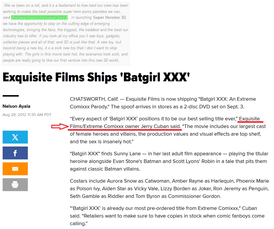 Extreme Comixxx made Supergirl XXX. Of note, the official web site claimed in early November 2011 that Jerry E owned Extreme Comixxx, but Nelson Ayala, writing for XBIZ, reported that Jerry Cuban was the owner. The image below contains a snippet from ExtremeComixxx.com on the top and a snippet from XBIZ on the bottom. Presumably, Jerry E and Jerry Cuban are the same person.