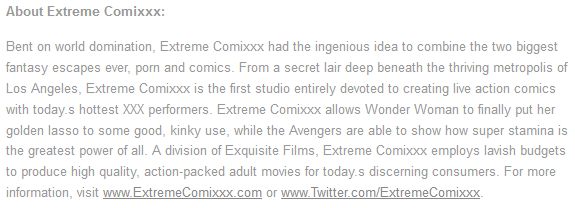 The company is (or “was,” more on that later) a division of Exquisite Films under the umbrella of Exquisite Multimedia, Inc. According to their web site, Extreme Comixxx had the idea to combine the “two biggest fantasy escapes ever, porn and comics.