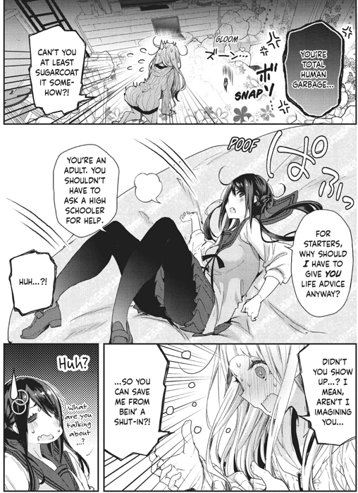 The comic called Yume a NEET (a young person Not in Employment, Education, or Training). (NOTE: The acronym NEET originated in the United Kingdom during the late 1980s. Some sources switch the order of “employment” and “education.”) Yume quit her job about a year ago. Since then she has been a recluse drinking lots of beer and ordering food (such as discounted doughnuts) online and taking great pains to avoid in-person contact with other human beings.