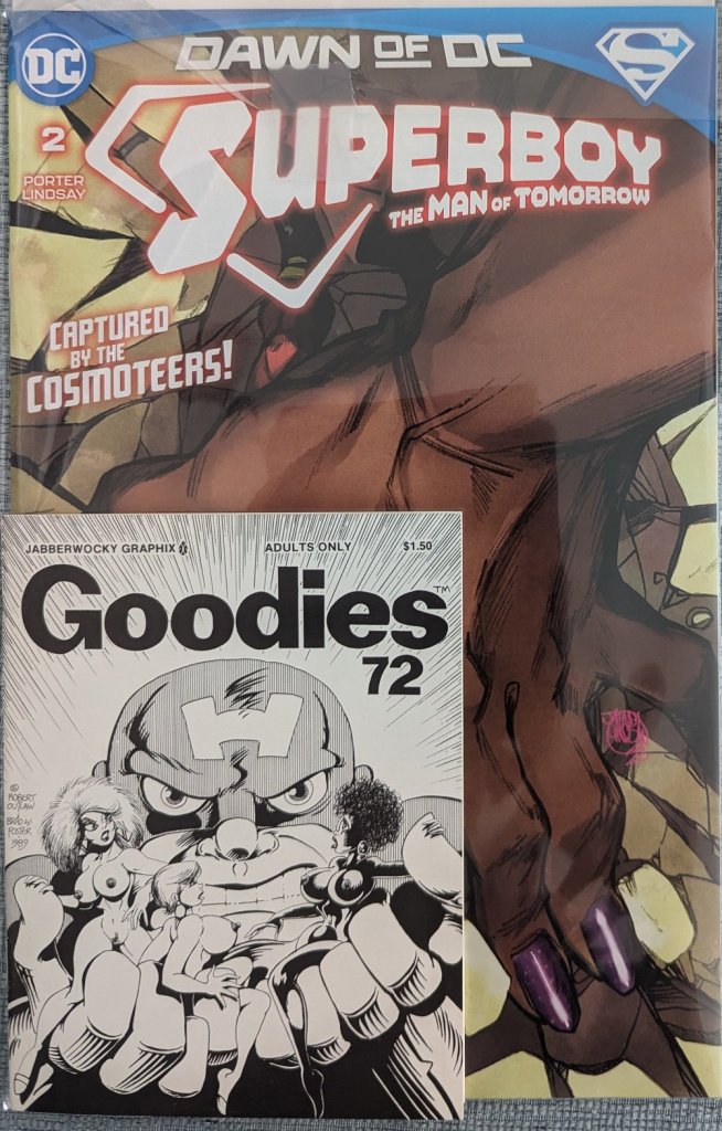 The first comic is Goodies #72 featuring three super heroines called The Living Dolls in a story entitled “Pounded by Hammer.” Robert Outlaw drew and wrote this issue while Brad W. Foster inked the cover. It’s a small comic only measuring 4 1/4 inches in width and 5 1/2 inches in height.
