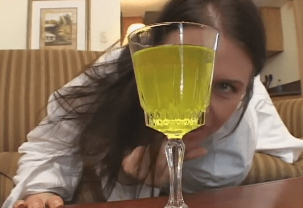 Apparently, she first learned about the strange yellow liquid from an unspecified TV advertisement. Right off the bat, I have a small complaint. Daphne commented “God, look how it bubbles” and said it was “fizzy.” However, I did not see any bubbles. That created a small problem and harmed suspension of disbelief. Actors should not claim something which audiences can plainly see is not true.