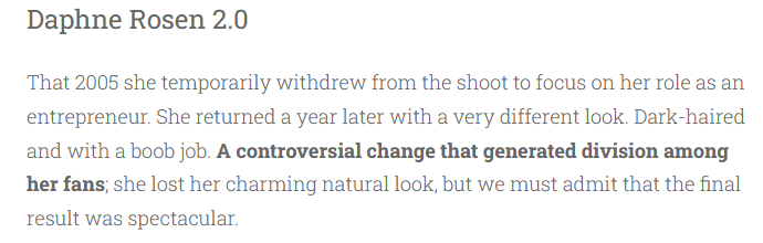 Daphne took some time off in 2005 and when she returned she had a boob job and dark hair.